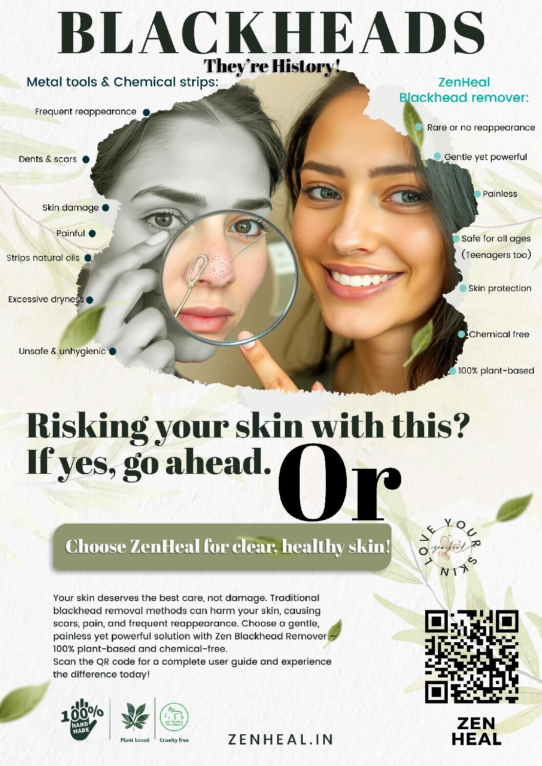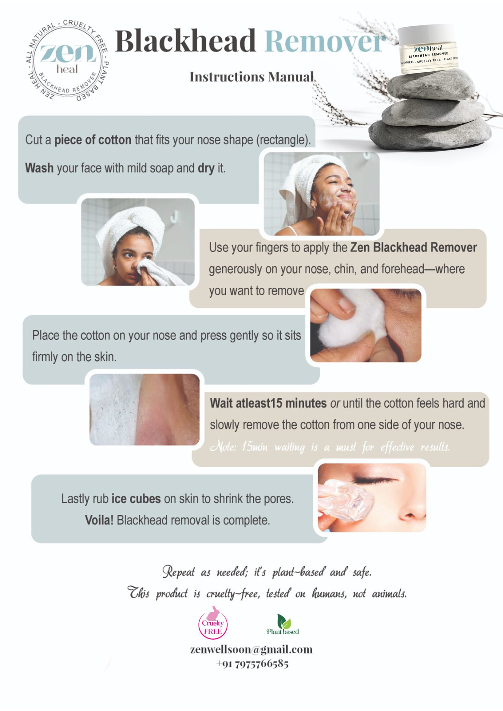 is that while commercial blackhead removers often strip away skin barriers, Zen Heal exclusively targets blackheads, whiteheads, and dirt, leaving skin barriers and natural oils intact. Overall, choosing an all-natural, plant-based blackhead and whitehead remover can help you achieve clearer, healthier skin while minimizing the risk of irritation and supporting environmental sustainability. This product is cruelty-free, tested on humans, not animals.